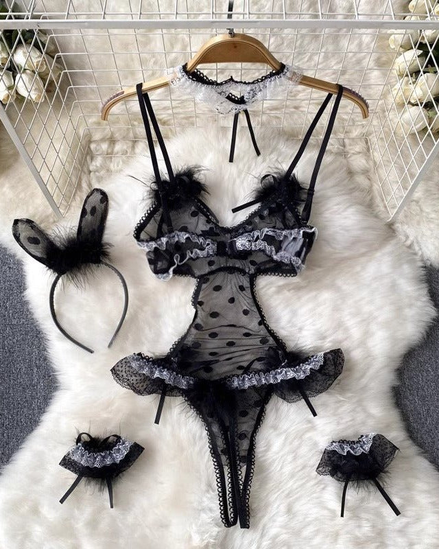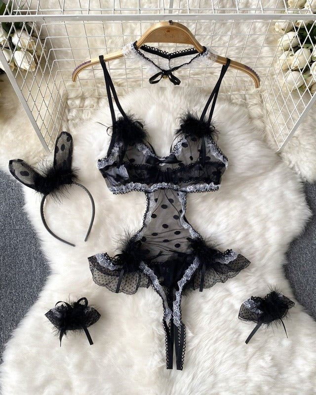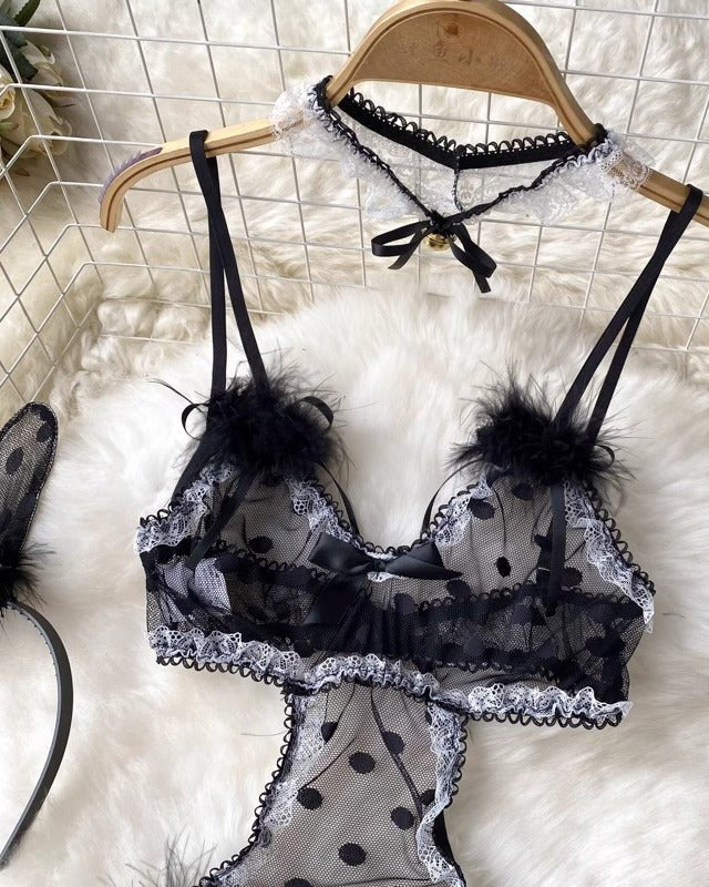 Unleash your inner feline with this playful lingerie set! The Feline Allure Teddy features a seductive design that will make you feel confident and alluring. Perfect for a night of fun and mischief. (Meow!)