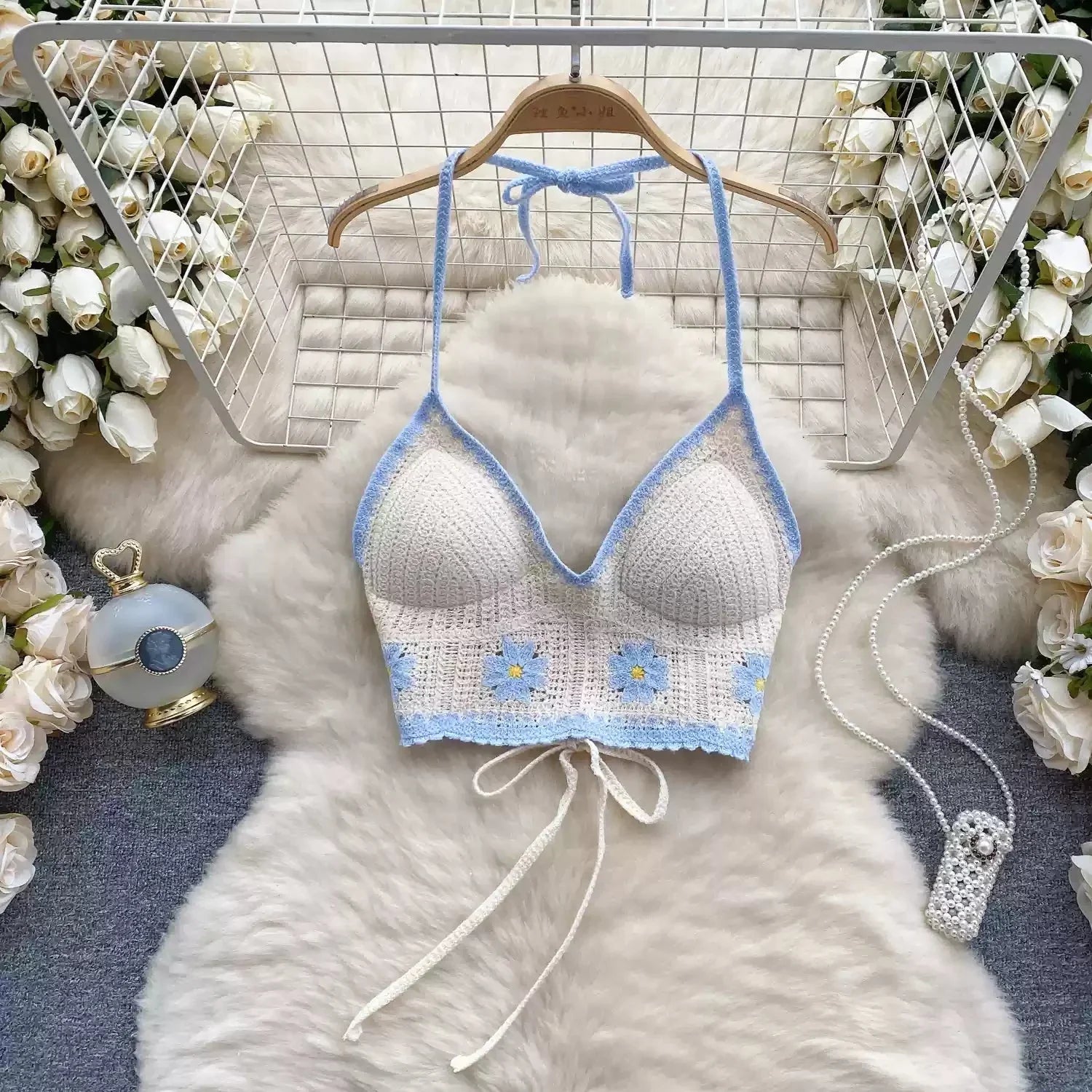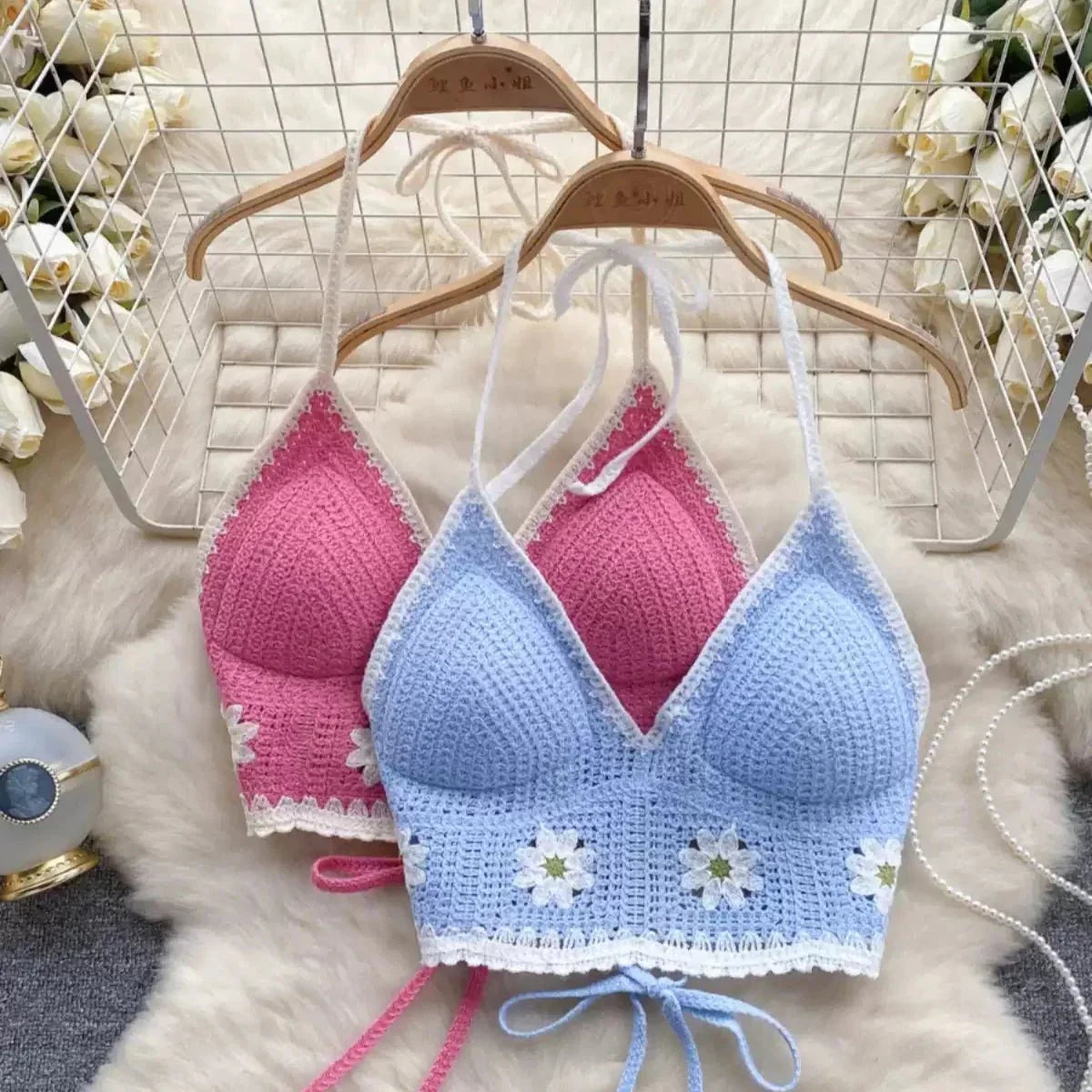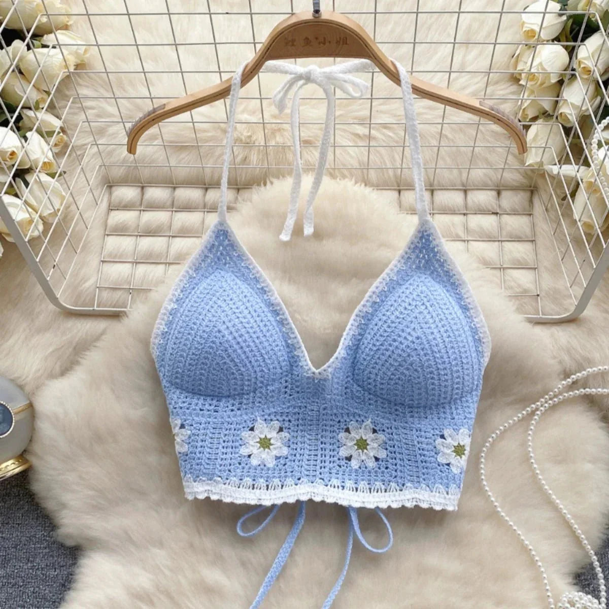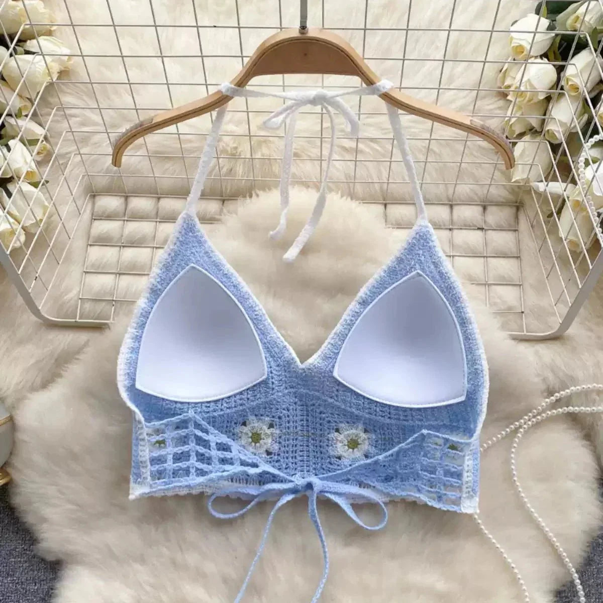 Get ready to turn heads with our Floral Tie Knot Backless Crochet Bikini Top. This playful top features a delicate floral print, a playful tie knot in the front, and a daring backless design. Perfect for soaking up the sun and making a statement!