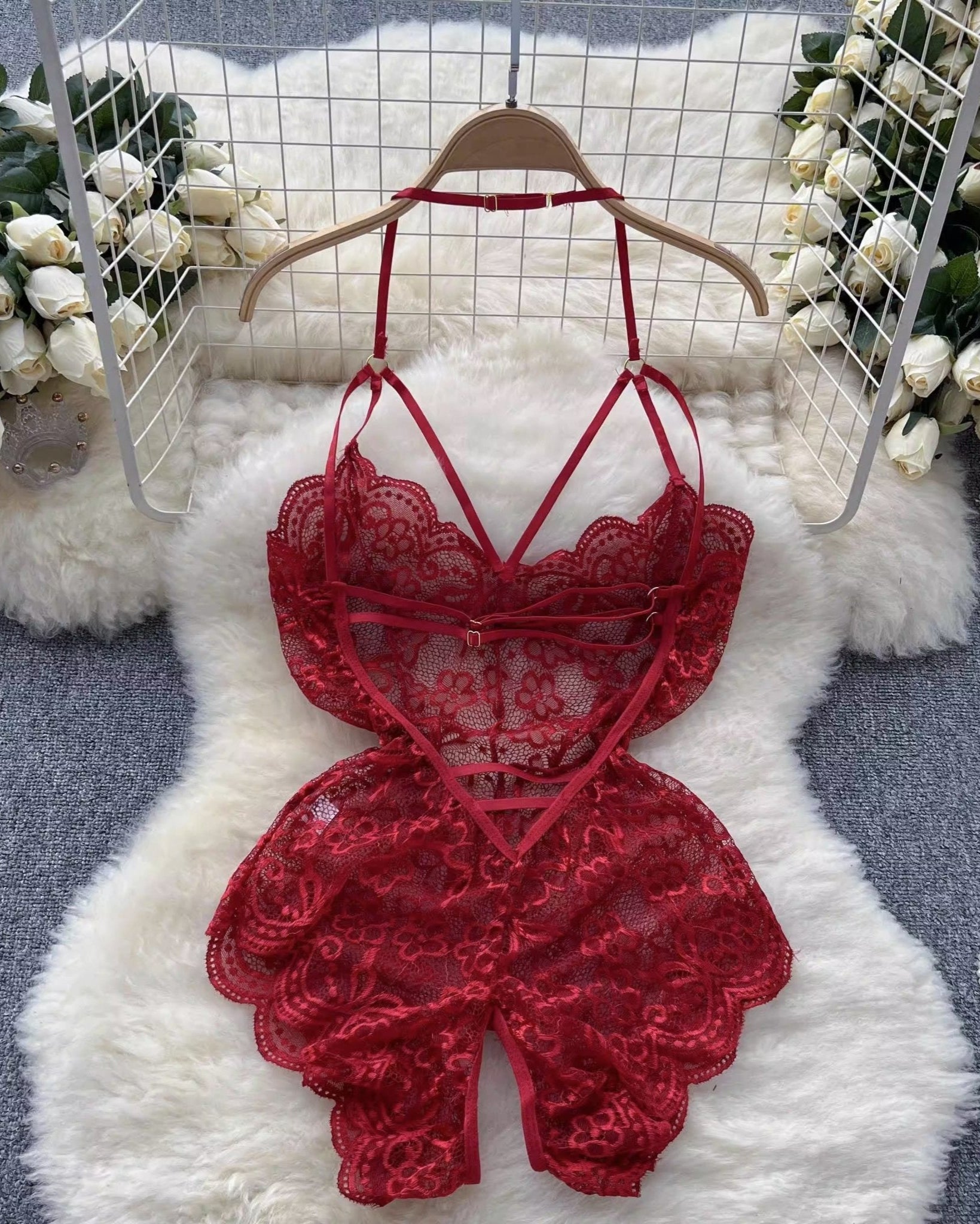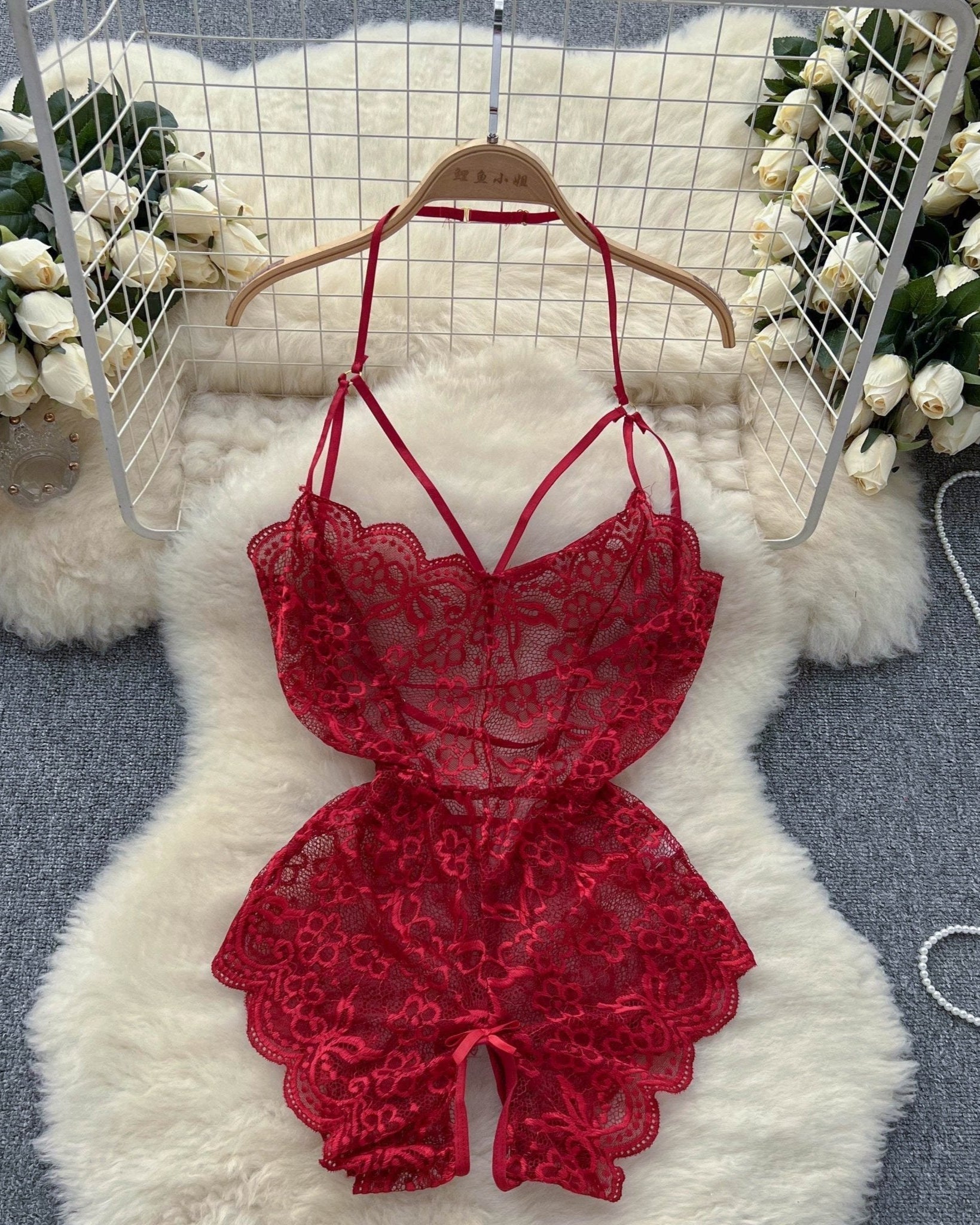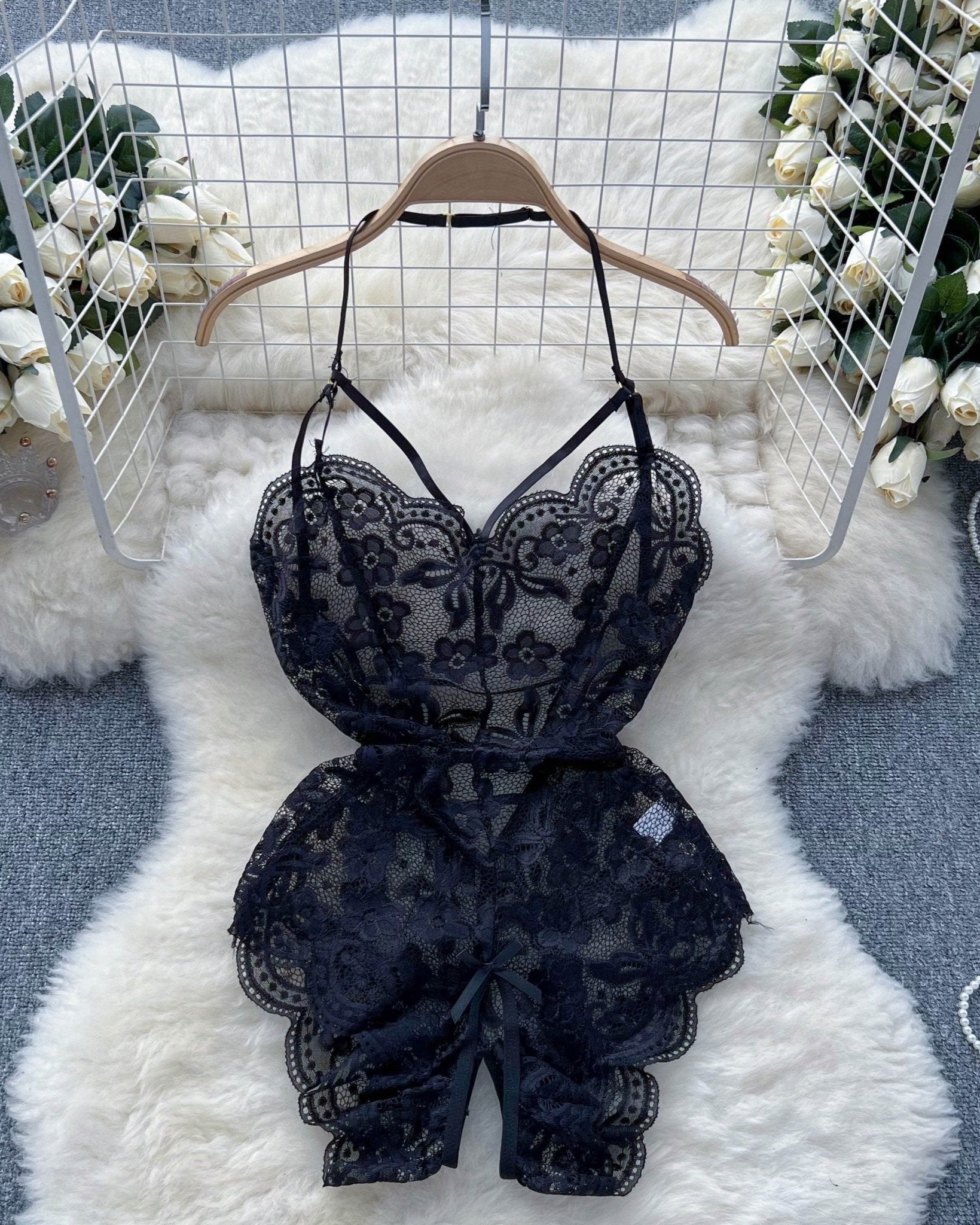 - Design Features: Scalloped lace edges, floral embroidery, adjustable halter-neck straps, open back design